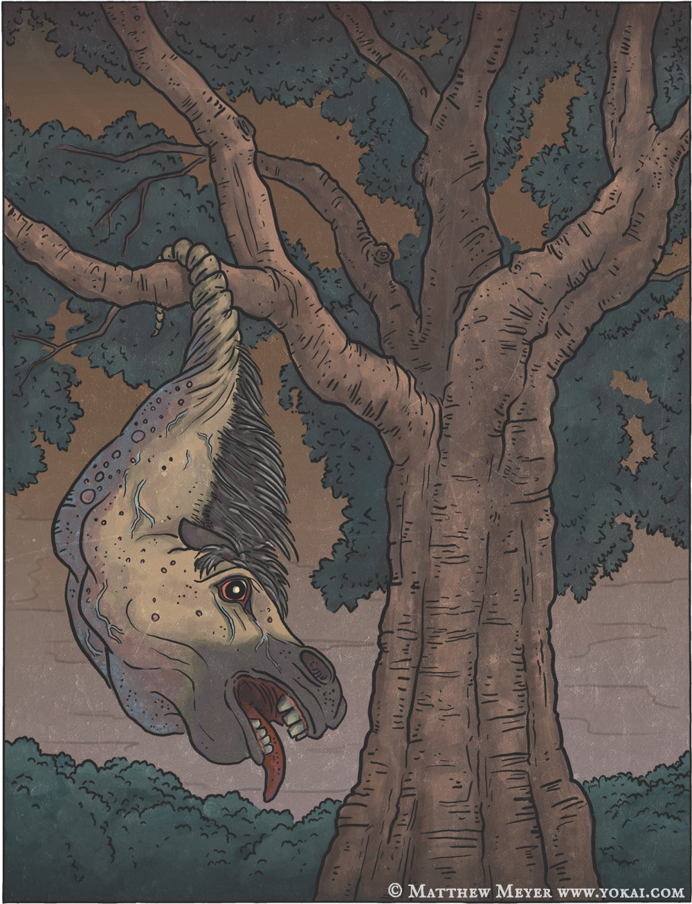 Sagari is a strange apparition from West Japan and Kyushu, particularly Okayama and Kumamoto prefectures. It takes the form of a grotesque horse’s head, which drops down from hackberry trees to startle travelers on the road. Sagari is known to drop down right in front of someone’s face and scream their unholy cry. However, those who hear a sagari’s whinnying and screaming may be stricken with a terrible fever. Sagari come from the spirits of horses that die on the road and are discarded and left to rot where they fall. The horses’ souls sometimes get caught in the trees as they rise from the bodies. The ones that stick in the trees cannot pass on to the next word and transform into these yokai.